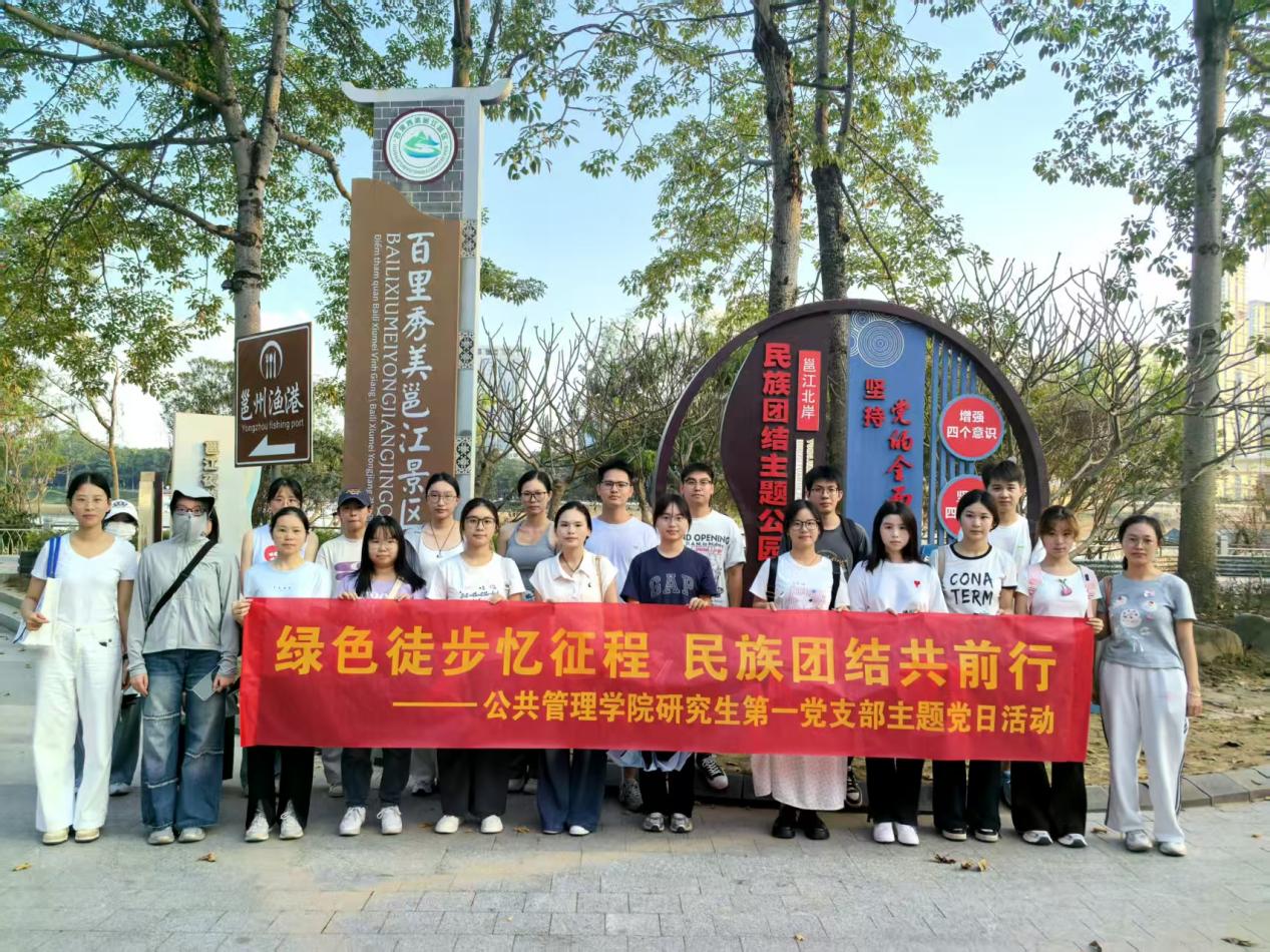 为深入学习贯彻习近平总书记关于民族团结的重要论述和视察广西时的重要讲话精神,将红色教育、民族团结教育与绿色发展理念有机融合,引导党员在徒步锻炼中感悟革命征程的艰辛,在互动交流中增强民族团结意识,2025年10月18日,必赢bwin官方网站研究生第一党支部开展了“绿色徒步忆征程 民族团结共前行”主题党日活动,本次活动由支部副书记陈玉婷主持,支部全体党员、发展对象、入党积极分子参加。